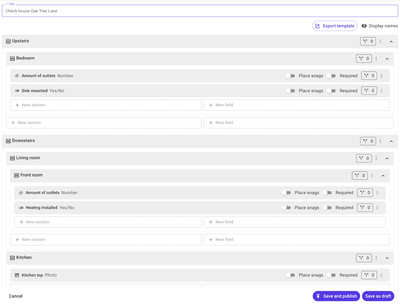 Indicate on the sliders whether the question is mandatory and whether snags can be placed with this question.