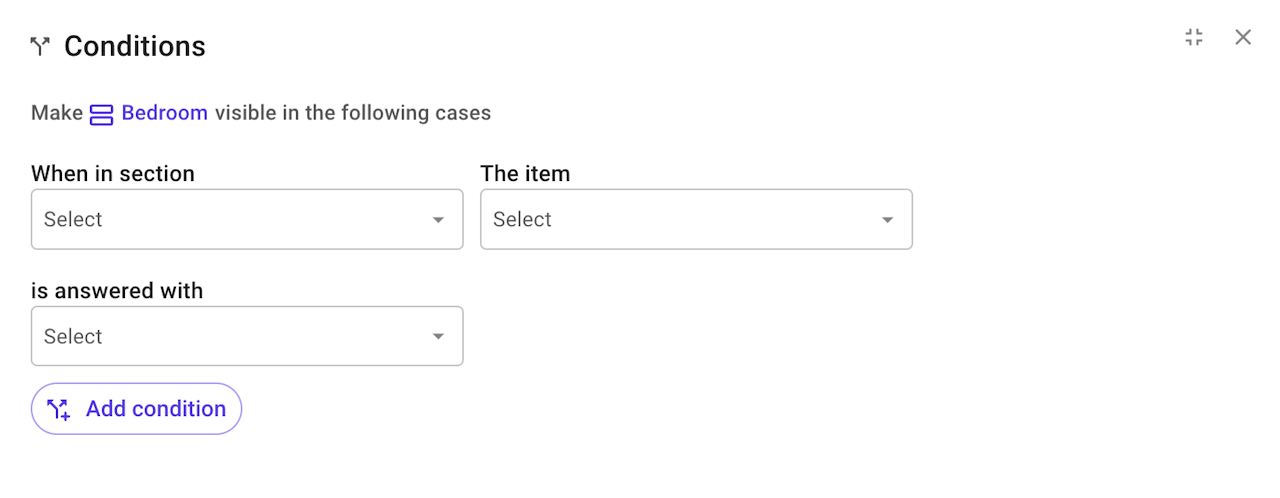 Conditions allow you to specify whether a section or field will only become visible after a certain answer to a previous question. To do this, click on the branch icon on the right of a section or field. You then choose which answer(s) must be given before the question is visible.