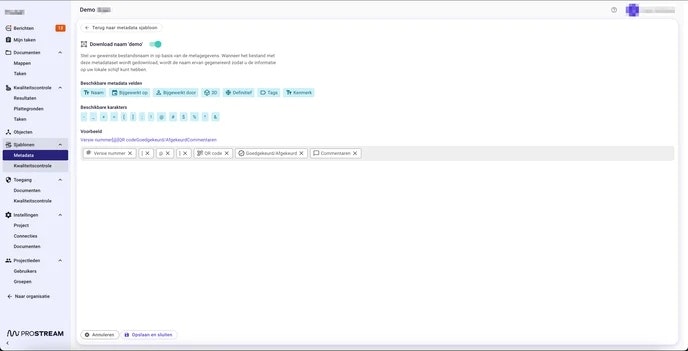 Prostream biedt de mogelijkheid om een downloadnaam te configureren voor elke metadataset. Deze downloadnaam wordt gebruikt als documentnaam bij het downloaden van het bestand.